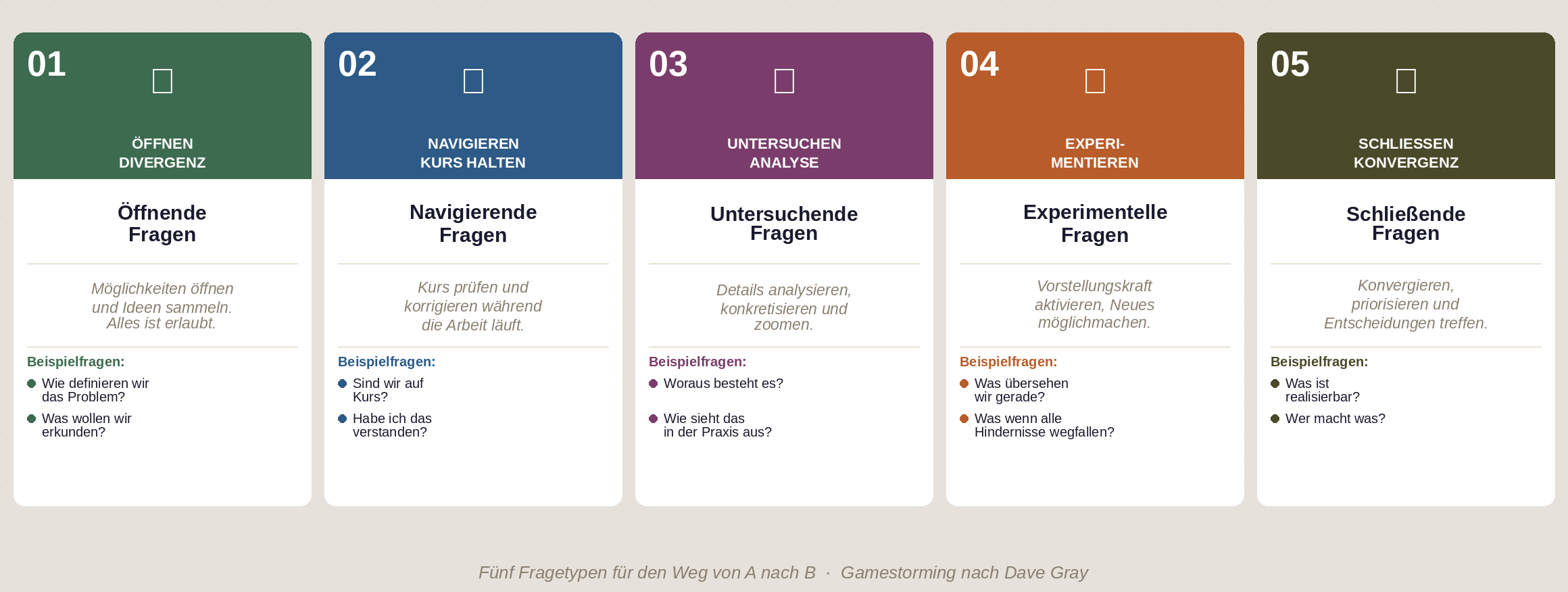 Die fünf Fragetypen bilden zusammen ein Diamant-Modell: Öffnen (Divergenz) → Erkunden mit Untersuchen & Experimentieren, begleitet vom Navigieren → Schließen (Konvergenz).