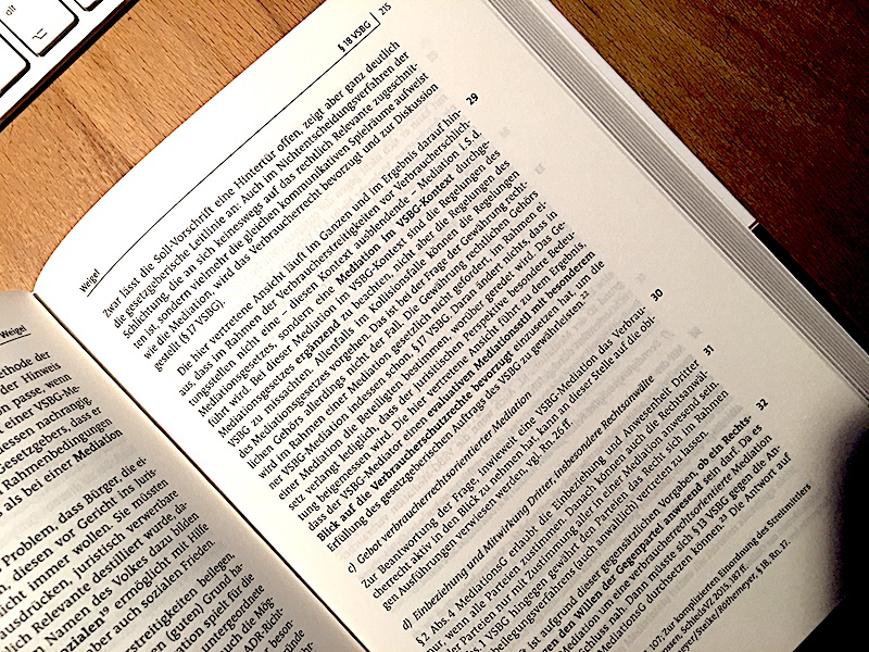 Nunmehr veröffentlicht! Der neue Kommentar zum Verbraucherstreitbeilegungsgesetz – mit unserer Kommentierung zum § 18 VSBG (Einsatz der Mediation bei Verbraucherstreitbeilegungen?). Dabei ist maßgeblich zu klären gewesen, ob es sich um eine „reine Mediation“ i.S.d. Mediationsgesetzes handelt oder um eine „speziell – um das Verbraucherrecht – angereicherte Mediation“ i.S.e. Mediation im VSBG-Kontext.